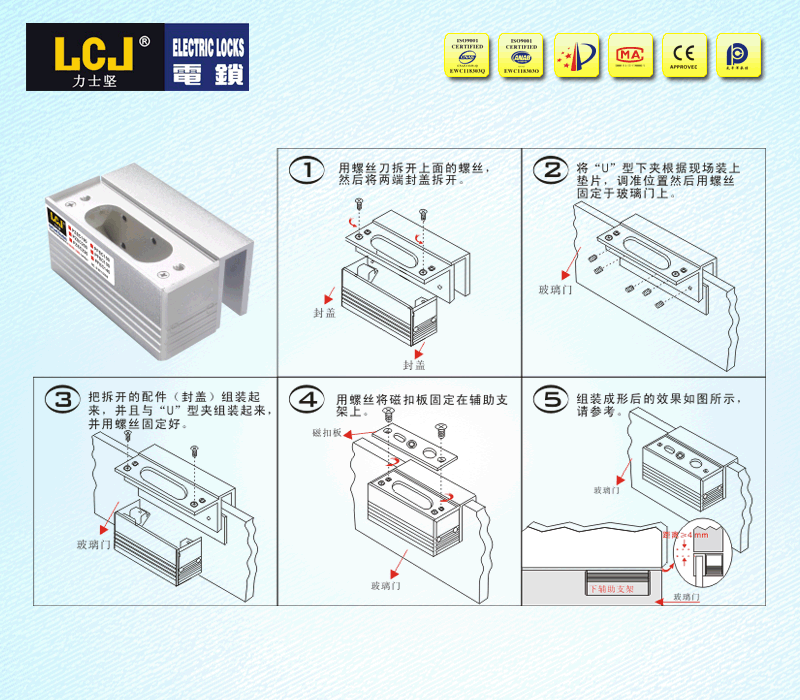 配合電插鎖EC235系列、EC235H磁扣板,應(yīng)用于8~12mm厚無(wú)框玻璃門(15mm玻璃特定) |