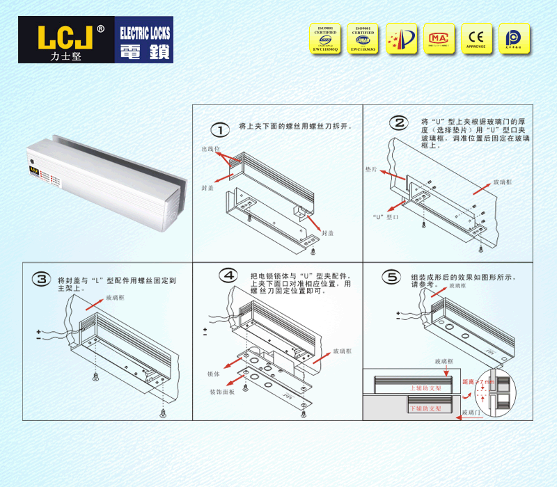 配合電插鎖EC235系列、EC235H鎖體,應(yīng)用于8~12mm厚上無框玻璃門(15mm玻璃特定) |